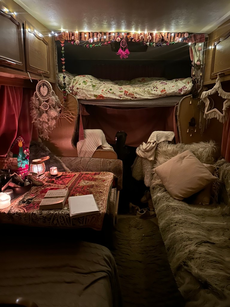 She’s a 1994 VW T4 Transporter – Motorhome style. At first, I envisaged one of these new converted Transit vans, but she’s perfect. Being in Eileen feels like an actual home. I don’t have to put away the bed every night and there’s quite a bit of storage for everything that I had to downsize to. Everyone who stays in Eileen absolutely loves her. She has such a magical vibe – so cosy, welcoming and homely.