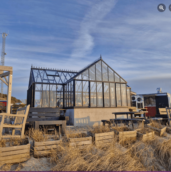 The restaurant is primarily a glass structure or orangery, enabling diners to have brilliant views of the dunes, where it’s situated, and out to sea, across the sands.